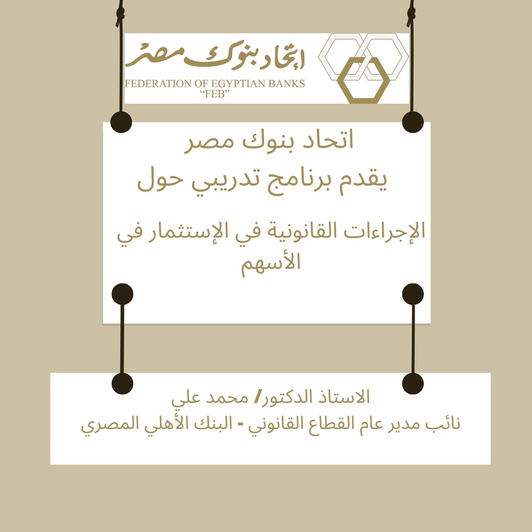 موضوع الدورة هو التعريف بأهم "الإجراءات القانونية في الإستثمار في الأسهم" الواردة بالقانون 159 لسنة 1981 بإصدار قانون شركات المساهمة وشركات التوصية بالأسهم والشركات ذات المسئولية المحدودة وشركات الشخص الواحد ولائحته التنفيذية وتعديلاتهم، وقانون سوق المال رقم 95 لسنة 1992 ولائحته التنفيذية وتعديلاتهم، والقانون رقم 194 لسنه 2020بإصدار قانون البنك المركزي.