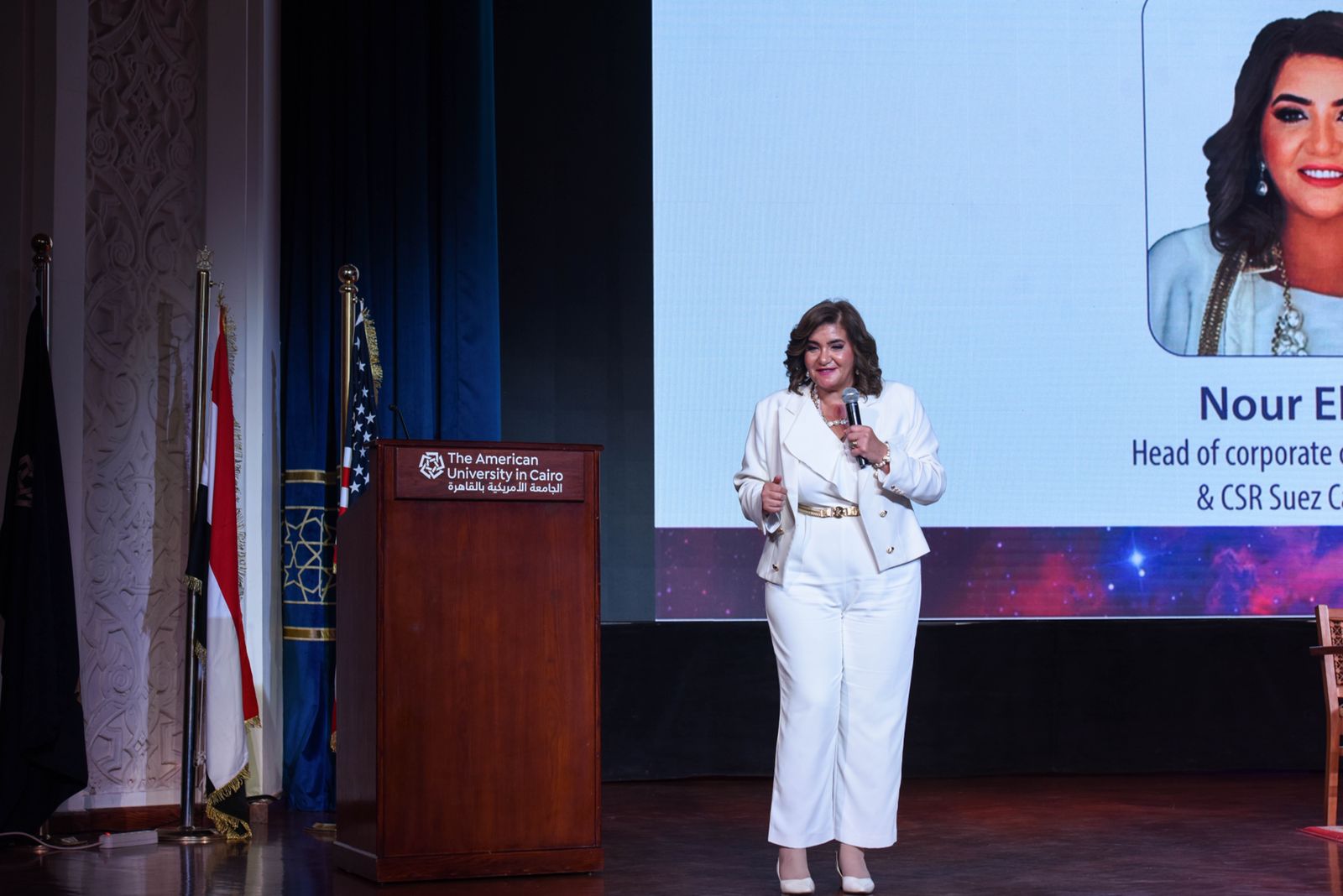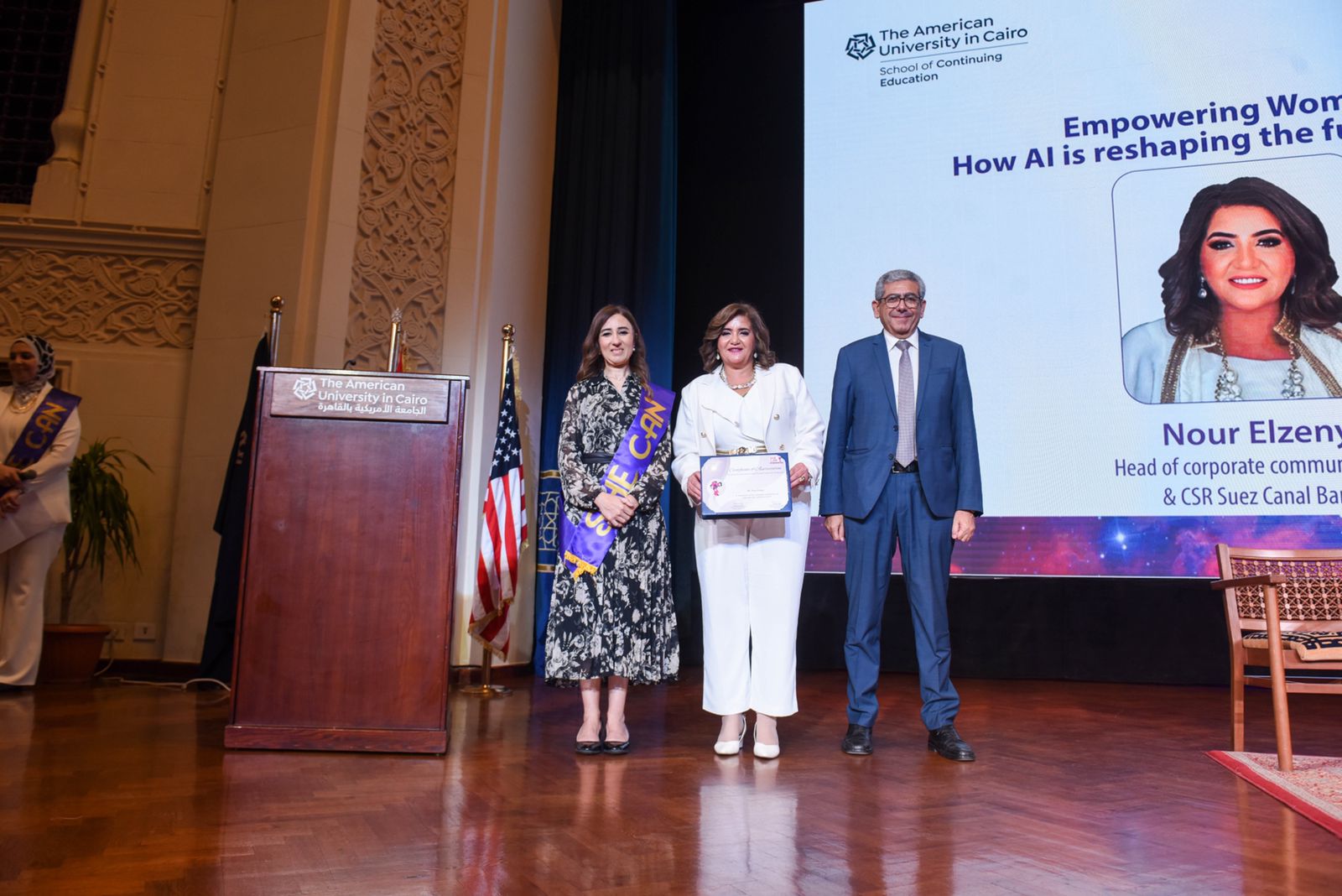 وقام د. محمود علام عميد كلية التعليم المستمر بالجامعة الأمريكية بالقاهرة، د. دعاء سالم رئيس أول وحده الاتصال والشراكات لكلية التعليم المستمر بالجامعة الأمريكية بالقاهرة و مؤسس مبادرة “هي قادره” التي تدعم المرأة و مساهمتها في تنميه الاقتصاد المصري بتكريم بنك قناة السويس لدورة اثناء الفعاليات.
