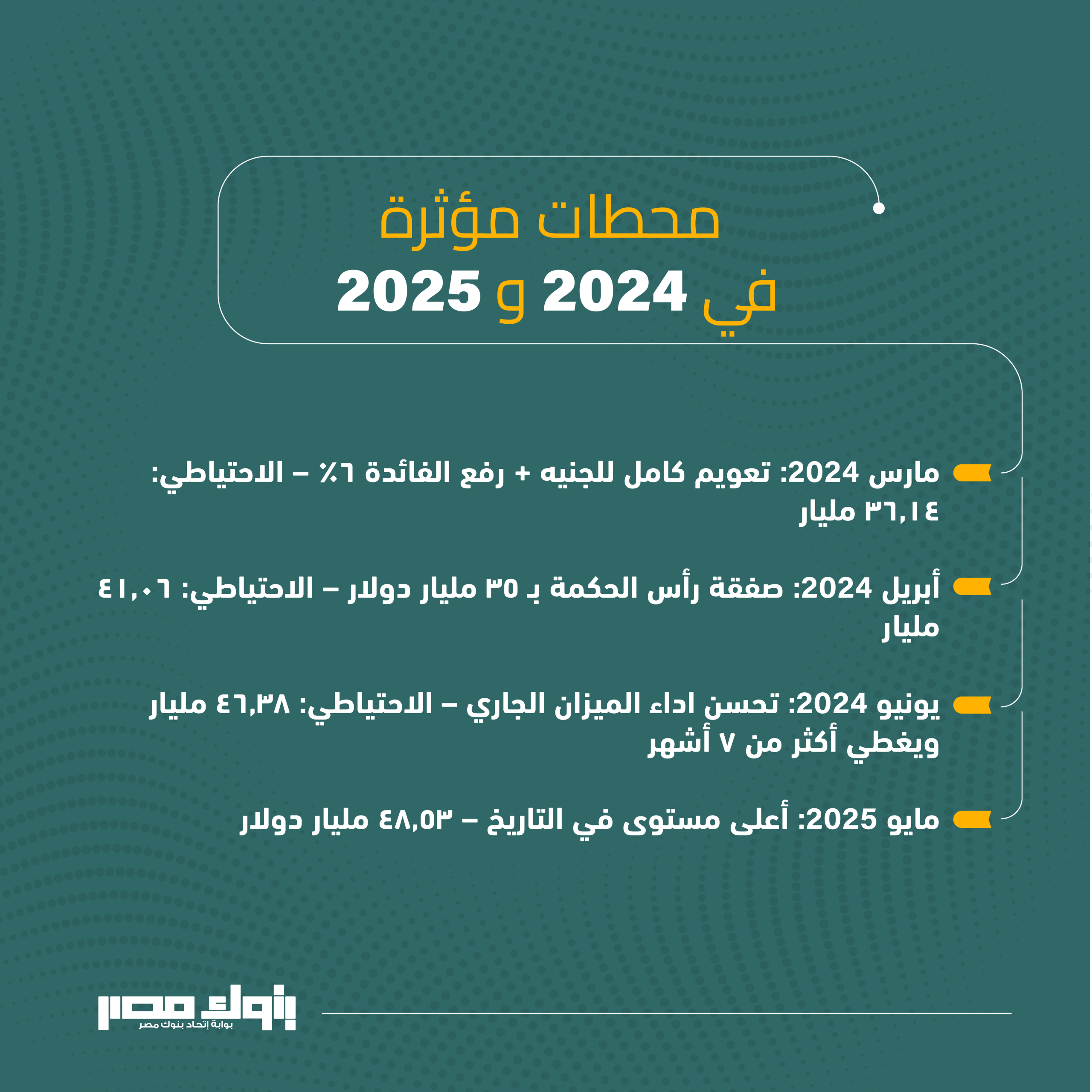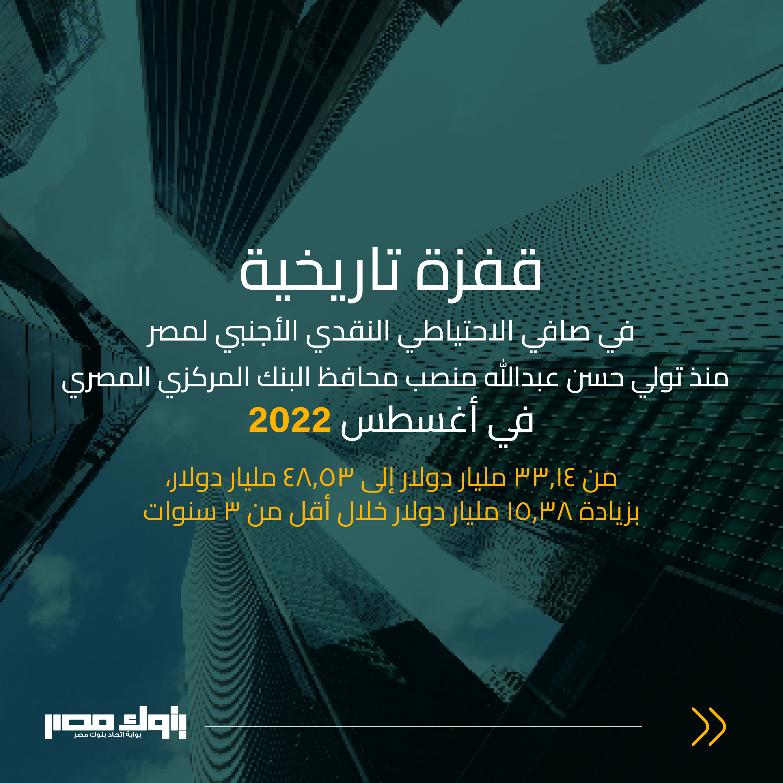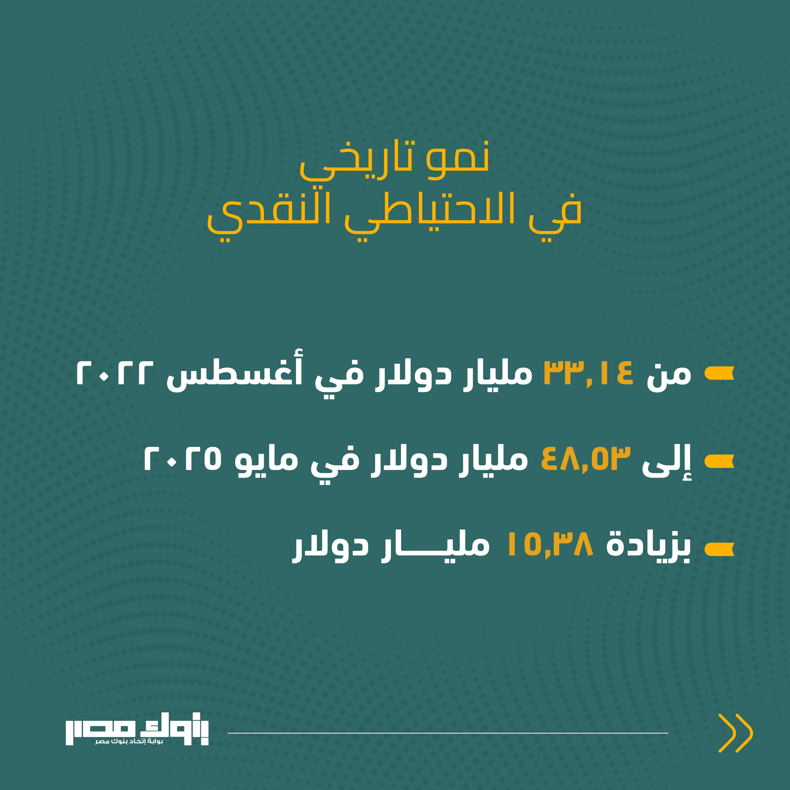 - البنك المركزي يعلن أن صافي الاحتياطي الأجنبي بلغ 48,53 مليار دولار، وهو أعلى مستوى منذ أكثر من عقدين.