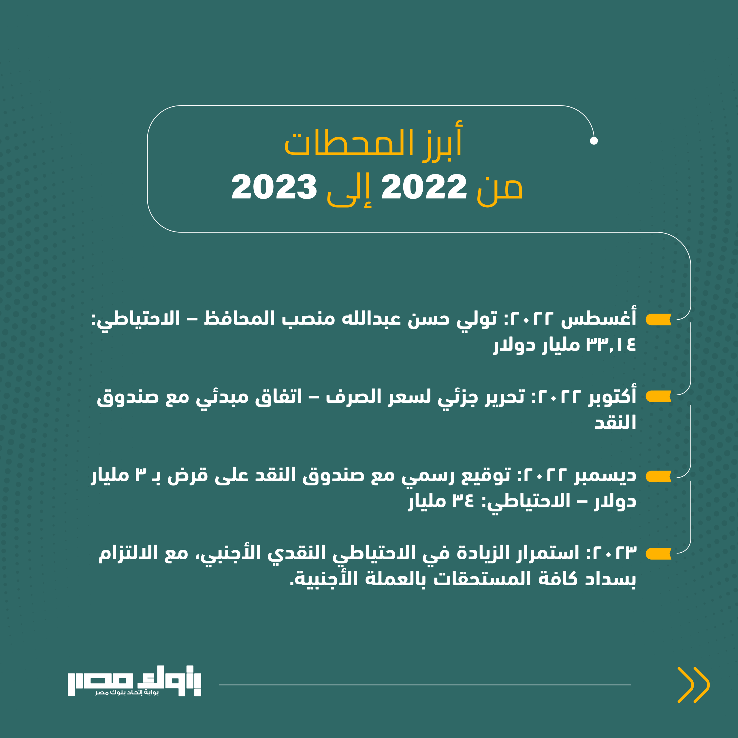 - تولي حسن عبدالله منصب محافظ البنك المركزي، وكان صافي الاحتياطي النقدي الأجنبي يبلغ نحو 33,14 مليار دولار.