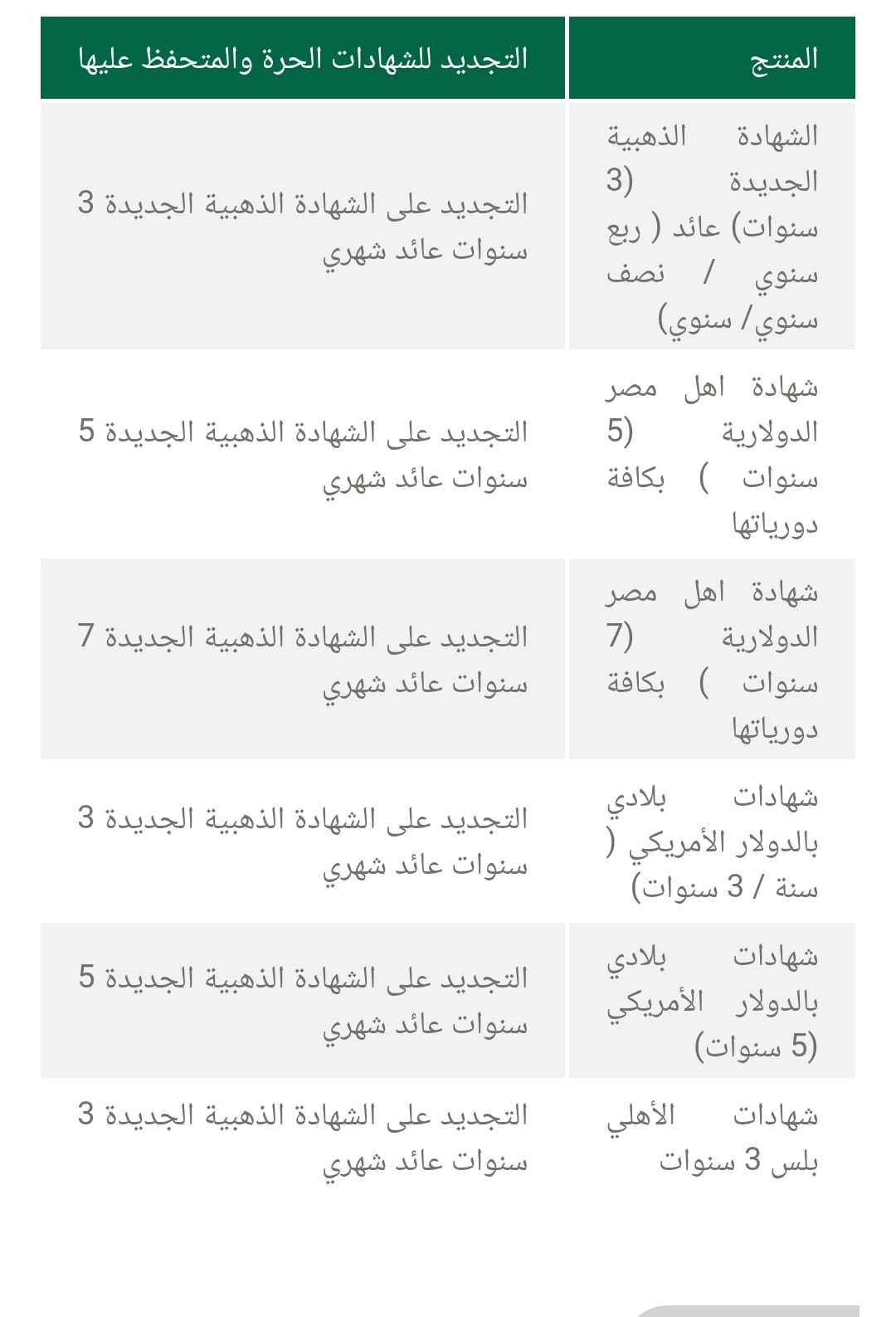 وأوضح البنك أنه تم إلغاء كافة دوريات صرف العائد للشهادة الذهبية الجديدة ماعدًا العائد الشهري ليتم تجديدها عند الاستحقاق كالتالي: