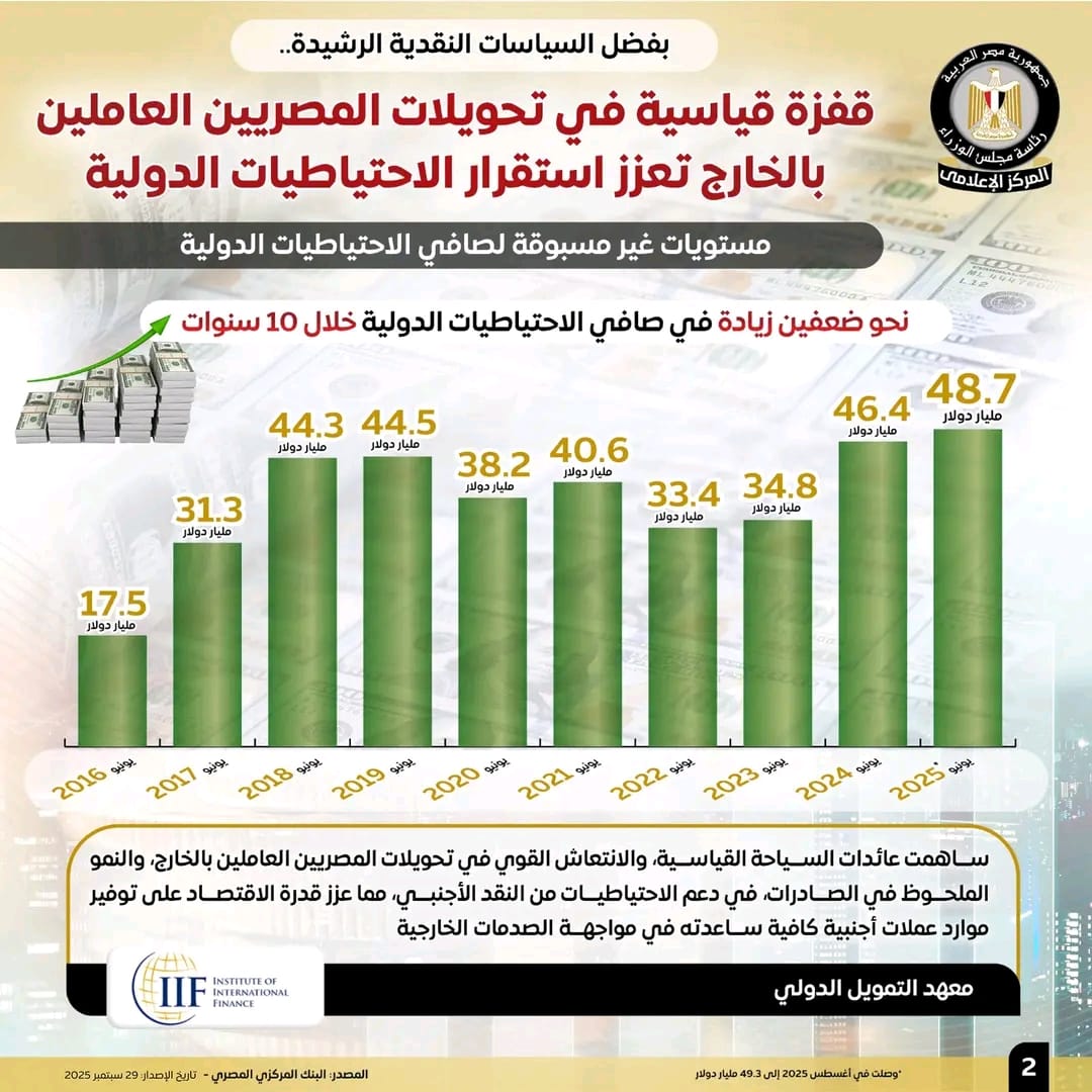 واستعرضت الإنفوجرافات تطور تحويلات المصريين بالخارج، والتي ارتفعت لأكثر من الضعف خلال 10 سنوات، لتصل إلى 36.5 مليار دولار عام 2024/2025، مقارنة بـ 17.1 مليار دولار عام 2015/2016، علمًا بأنها قد سجلت نحو 3.8 مليار دولار خلال شهر يوليو 2025، وهو أعلى مستوى شهري يتم تسجيله.