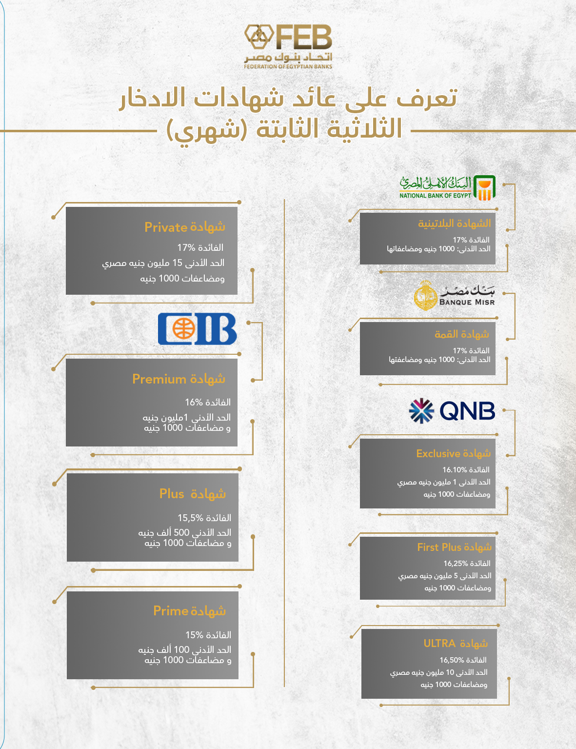 ويستعرض الإنفوجراف أبرز ملامح هذه الشهادات، من حيث نسبة العائد والحد الأدنى للاكتتاب، بما يساعد العملاء على التعرف على البدائل المتاحة أمامهم واختيار الأنسب لخططهم الاستثمارية والادخارية.