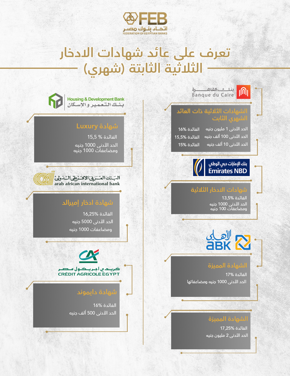 تنشر بوابة اتحاد البنوك أحدث تفاصيل عوائد شهادات الادخار الثلاثية ذات العائد الثابت (شهري) بالبنوك العاملة في السوق المحلي، والتي تتراوح نسب عوائدها بين 13.5% وحتى 17.25%، وفقًا لسياسات كل بنك ونوع الشهادة المطروحة.