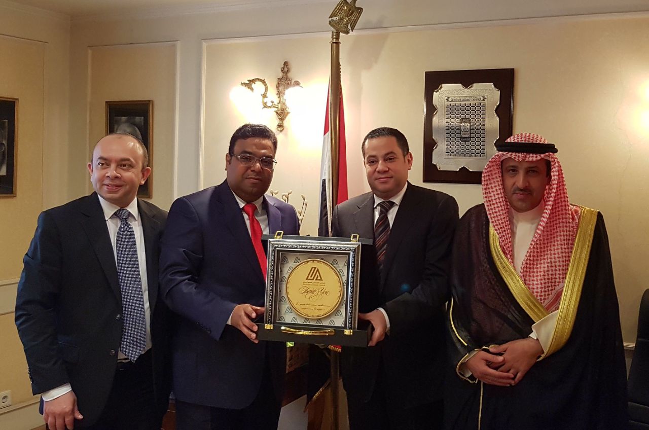 وقد سلم وفد المجلس الاقتصادى الأفرو آسيوى درع المنظمة لخالد بدوى وزير قطاع الأعمال العام.
