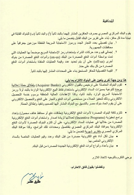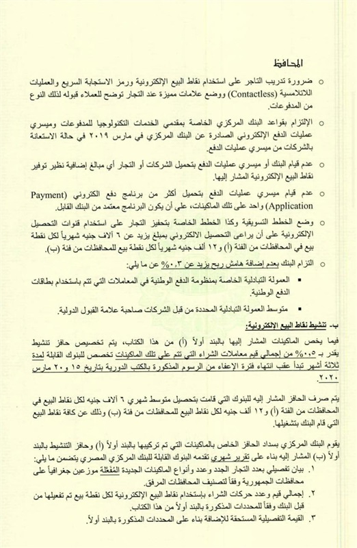 ونبه البنك المركزي إلى ضرورة الالتزام بالقواعد الخاصة بمقدمي خدمات التكنولوجيا للمدفوعات وميسري عمليات الدفع الإلكتروني الصادرة عن البنك المركزي المصري في مارس 2019 في حالة الاستعانة بالشركات من ميسري عمليات الدفع، مع عدم قيام البنك أو ميسري عمليات الدفع بتحميل الشركات أو التجار أي مبالغ إضافية نظير توفير نقاط البيع الالكترونية.
