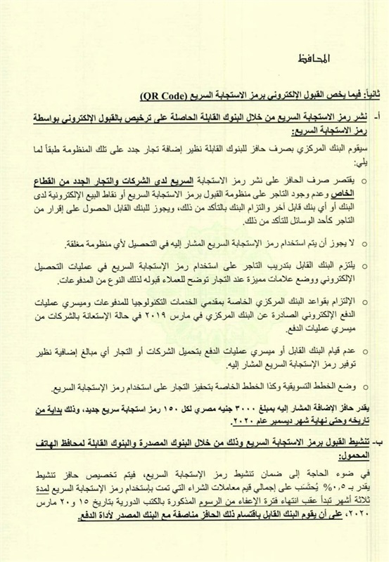 وأكد البنك المركزي على ضرورة تدريب التجار على استخدام ماكينات الدفع الإلكتروني وكيفية استخدام رمز الاستجابة السريع والعمليات اللا تلامسية ووضع علامات مميزة عند التجار توضح للعملاء قبوله لذلك النوع من المدفوعات.