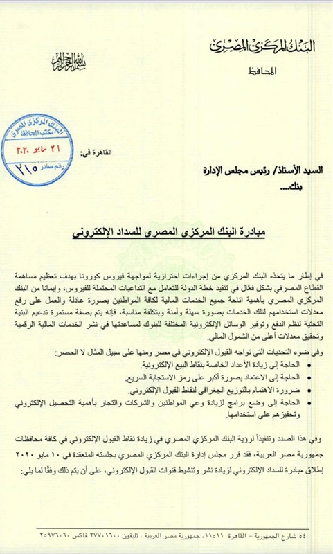 أطلق البنك المركزي المصري مبادرة جديدة لتنشيط الدفع الإلكتروني، وتقليل الإعتماد على النقود ” الكاش” وذلك ضمن الإجراءات الاحترازية التي يتخذها لمواجهة فيروس كورونا، بهدف تعظيم مساهمة القطاع المصرفي بشكل فعال في خطة الدولة للتعامل مع التداعيات المحتملة للفيروس.