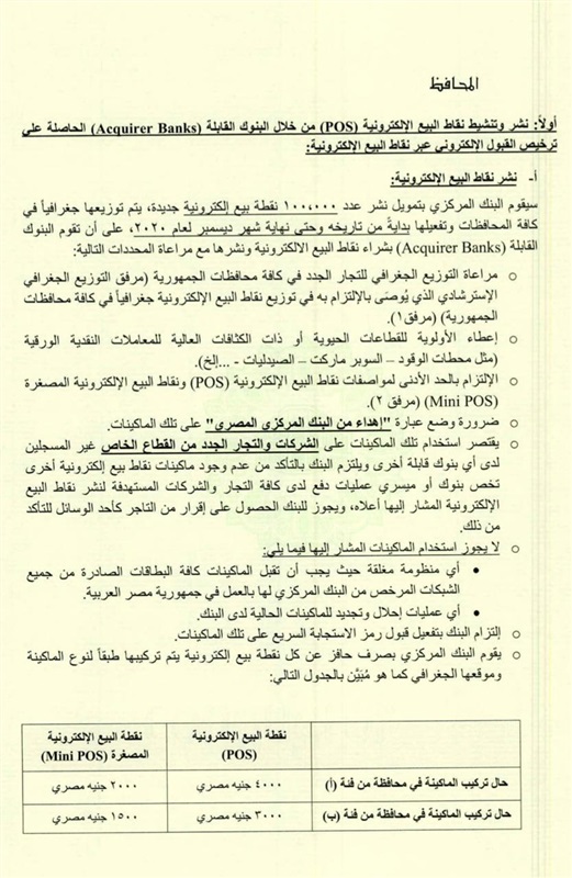كما أشترط أن يتم إعطاء الأولوية للقطاعات الحيوية أو ذات الكثافات العالية للمعاملات النقدية الورقية مثل محطات الوقود والسوبر ماركت والصيدليات، مع الالتزام بالحد الأدنى لمواصفات نقاط البيع الإلكترونية POS ونقاط البيع الإلكترونية المصغرة Mini POS وضرورة وضع عبارة (إهداء من البنك المركزي المصري) على تلك الماكينات.