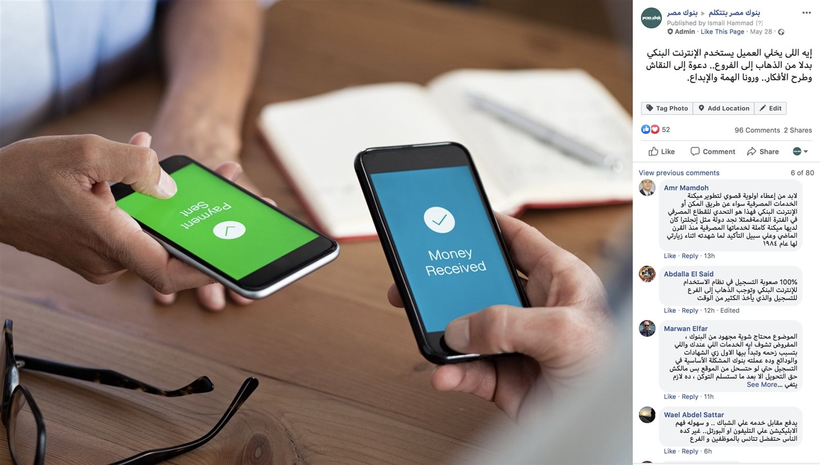 طرح جروب “بنوك مصر بتتكلم” -الجروب الرسمي الصادر عن “بنوك مصر”- البوابة الرسمية لاتحاد بنوك مصر، فكرة للنقاش حول العوامل، التي تدفع العملاء إلى استخدام الإنترنت البنكي بدلا من الذهاب إلى الفرع، من خلال المنشور التالي: “إيه اللى يخلي العميل يستخدم الإنترنت البنكي بدلا من الذهاب إلى الفروع؟ دعوة إلى النقاش وطرح الأفكار.. ورّونا الهمة والإبداع.”