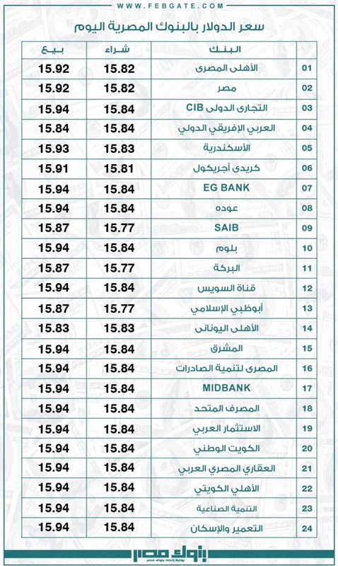 سجلت أسعار صرف الدولار ارتفاعا طفيفا في نهاية تعاملات الأحد في 16 بنك، وسجل أعلى سعر له في البنوك التالية: (التجاري الدولي – العربي الإفريقي الدولي – المصري الخليجي – عَوده – بلوم – المشرق – قناة السويس – المصري لتنمية الصادرات – MIDBANK – المصرف المتحد – الإستثمار العربي – الكويت الوطني -العقاري المصري – الأهلي الكويتي – التنمية الصناعية – التعمير والإسكان) عند مستوى 15.84 جنيهًا للشراء، و 15.94 للبيع.