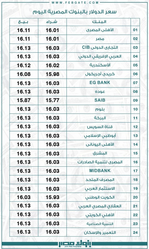 ارتفع سعر صرف الدولار في نهاية تعاملات الأربعاء في 22 بنكا، وسجل أعلى سعر له في البنوك التالية: (التجاري الدولي – العربي الإفريقي الدولي – المصري الخليجي – عَوده – بلوم – البركة – المشرق – قناة السويس – أبوظبي الإسلامي – الأهلي اليوناني – المصري لتنمية الصادرات – MIDBANK – المصرف المتحد – الإستثمار العربي – العقاري المصري العربي – الأهلي الكويتي – التنمية الصناعية – التعمير والإسكان) عند مستوى 16.03 جنيهًا للشراء، و 16.13 للبيع.