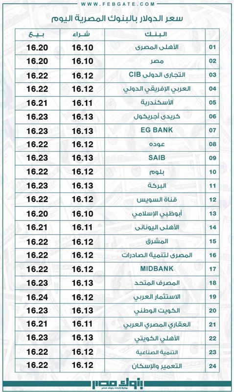 وفي مسح لـ”بنوك مصر” شمل 24 بنكًا عاملًا بالسوق المصرية، سجل أقل سعر لصرف الدولار في البنوك التالية: (الأهلي المصري – مصر – الأهلي اليوناني) عند مستوى 16.10 جنيهات للشراء، و16.20 جنيهًا للبيع.