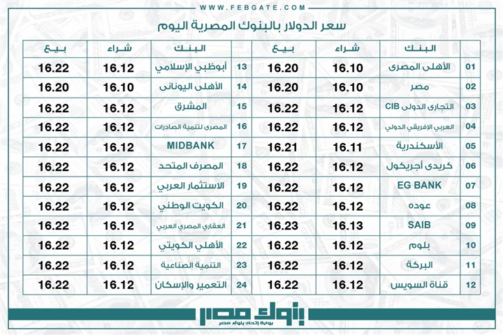 وفي مسح لـ”بنوك مصر” شمل 24 بنكًا عاملًا بالسوق المصرية، سجل أقل سعر لصرف الدولار في البنوك التالية: ( الأهلي المصري – مصر – الأهلي اليوناني ) عند مستوى 16.10 جنيهًا للشراء، و 16.20 جنيهًا للبيع.