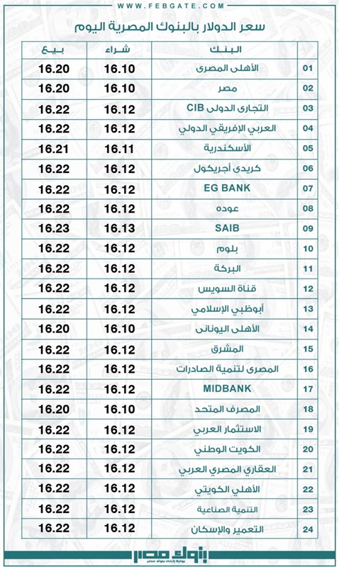وفي مسح لـ”بنوك مصر” شمل 24 بنكًا عاملًا بالسوق المصرية، سجل أقل سعر لصرف الدولار في البنوك التالية: ( الأهلي المصري – مصر – الأهلي اليوناني – المصرف المتحد ) عند مستوى 16.10 جنيهًا للشراء، و 16.20 جنيهًا للبيع.