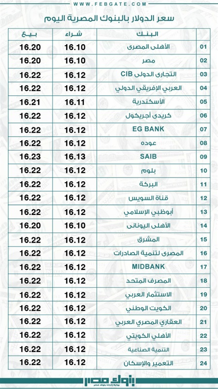 وفي مسح لـ”بنوك مصر” شمل 24 بنكًا عاملًا بالسوق المصرية، سجل أقل سعر لصرف الدولار في البنوك التالية: ( الأهلي المصري – مصر – الأهلي اليوناني ) عند مستوى 16.10 جنيهًا للشراء، و 16.20 جنيهًا للبيع.