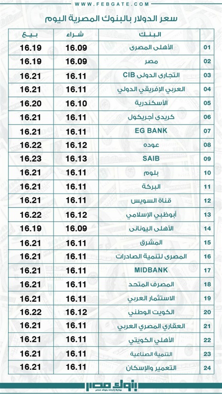 وفي مسح لـ”بنوك مصر” شمل 24 بنكًا عاملًا بالسوق المصرية، سجل أقل سعر لصرف الدولار في البنوك التالية: ( الأهلي المصري – مصر – الأهلي اليوناني ) عند مستوى 16.09 جنيهًا للشراء، و 16.19 جنيهًا للبيع.