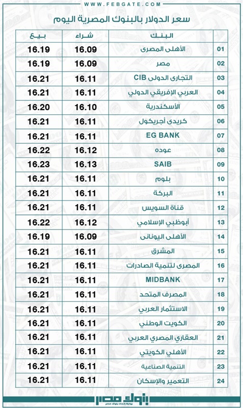 وفي مسح لـ”بنوك مصر” شمل 24 بنكًا عاملًا بالسوق المصرية، سجل أقل سعر لصرف الدولار في البنوك التالية: ( الأهلي المصري – مصر – الأهلي اليوناني ) عند مستوى 16.09 جنيهًا للشراء، و 16.19 جنيهًا للبيع.