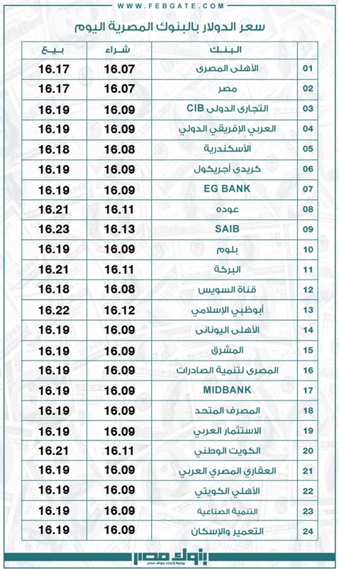 وفي مسح لـ”بنوك مصر” شمل 24 بنكًا عاملًا بالسوق المصرية، سجل أقل سعر لصرف الدولار في البنوك التالية: ( الأهلي المصري – مصر ) عند مستوى 16.07 جنيهًا للشراء، و 16.17 جنيهًا للبيع.