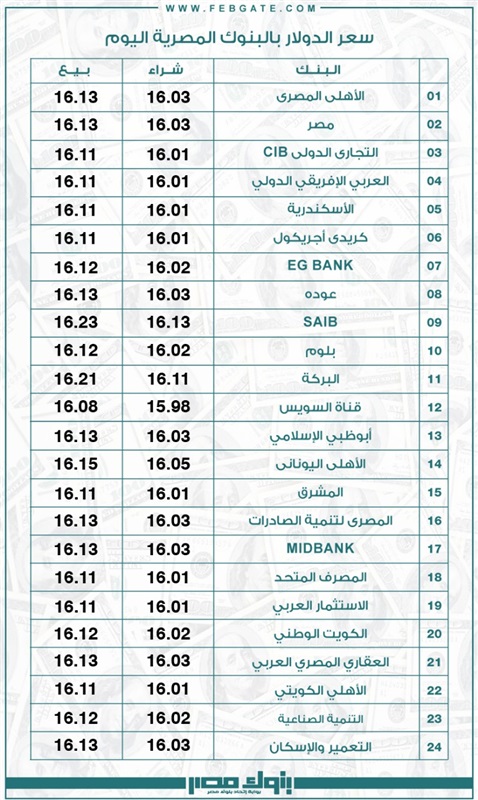وفي مسح لـ”بنوك مصر” شمل 24 بنكًا عاملًا بالسوق المصرية، سجل أقل سعر لصرف الدولار في بنك: ( قناة السويس ) عند مستوى 15.98 جنيهًا للشراء، و 16.08 جنيهًا للبيع.