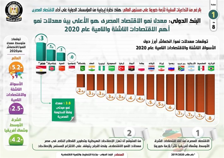 وجاء في الإنفوجراف، توقع البنك الدولي بأن يكون معدل نمو الاقتصاد المصري هو الأعلى بين معدلات نمو أهم الاقتصادات الناشئة والنامية عام 2020.