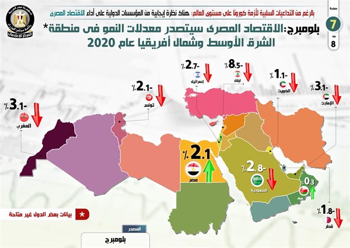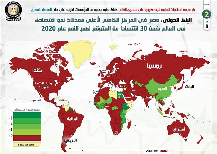 وأبرز الإنفوجراف، توقعات البنك الدولي لمعدلات النمو الاقتصادي لدول العالم عام 2020، والذي توقع أن تحتل مصر المركز الخامس لأعلى معدلات نمو اقتصادي في العالم بمعدل نمو يصل إلى 3%، وذلك ضمن 30 اقتصاداً من المتوقع لهم النمو عام 2020، أبرزهم الصين، وفيتنام، في المقابل توقع البنك نفسه أن تحقق معظم دول العالم انكماشاً في الناتج المحلي الإجمالي منها تركيا وقطر وإيران وروسيا وألمانيا وإسبانيا والولايات المتحدة الأمريكية والمملكة المتحدة.