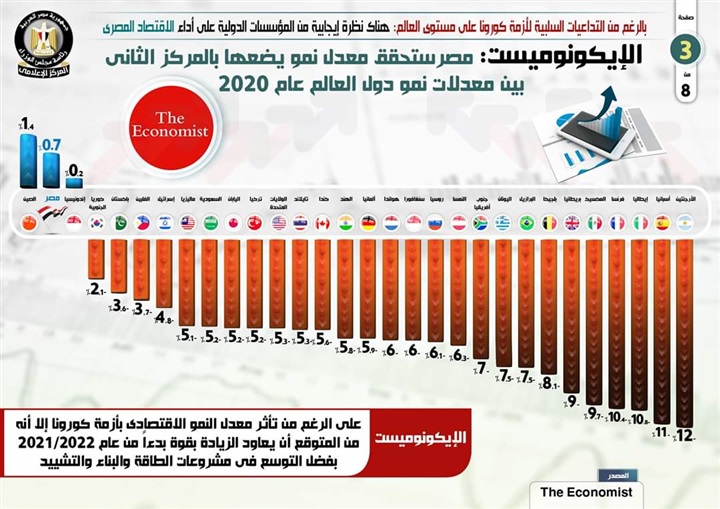 وجاء في الإنفوجراف، توقعات الإيكونوميست، بتحقيق مصر معدل نمو يضعها بالمركز الثاني بين معدلات النمو لدول العالم عام 2020، بنسبة 0.7%، وذلك بعد الصين التي من المتوقع أن تحتل المرتبة الأولى بمعدل نمو 1.4%، لتأتي إندونيسيا في المرتبة الثالثة بمعدل نمو متوقع 0.2%.