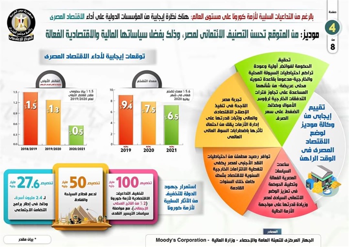 وجاء في الإنفوجراف، توقع وكالة “موديز” تحسن التصنيف الائتماني لمصر، وذلك بفضل سياساتها المالية والاقتصادية الفعالة.