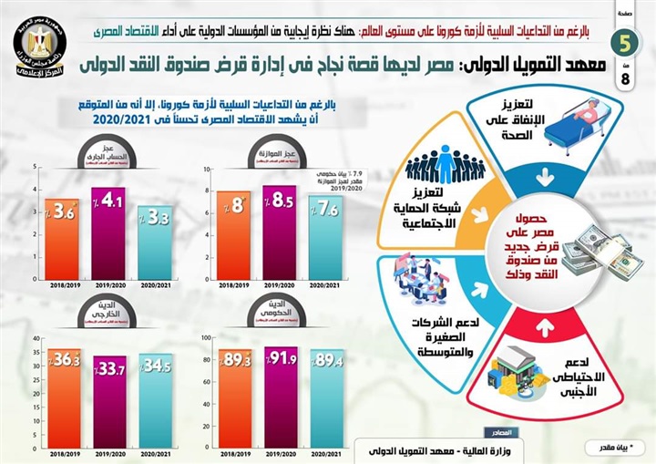 وجاء في الإنفوجراف، إشارة “معهد التمويل الدولي” إلى أن مصر لديها قصة نجاح في إدارة قرض صندوق النقد الدولي، موضحاً أن حصول مصر على قرض جديد من الصندوق يعزز الإنفاق على الصحة، وكذلك تعزيز شبكة الحماية الاجتماعية، فضلاً عن دعم الشركات الصغيرة والمتوسطة، هذا بجانب دعم الاحتياطي الأجنبي.