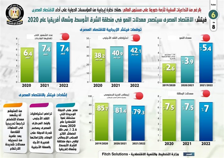 ورصد الإنفوجراف، إشادات وكالة “فيتش” بالاقتصاد المصري، مُؤكدة أن مصر هي الدولة الوحيدة التي ستحقق نمواً اقتصادياً عام 2020 بمعدل 2.6%، في ظل انكماش الناتج المحلي الإجمالي لباقي دول منطقة الشرق الأوسط وشمال أفريقيا، مشيرة إلى أن تراكم احتياطيات النقد الأجنبي بالبنك المركزي المصري يعكس قدرة الدولة على الوفاء بالتزاماتها قصيرة الأجل بالعملة الأجنبية، كما توقعت أن يشهد معدل التضخم تراجعاً تدريجياً في السنوات القادمة بعد عامين من تسجيله معدلات شديدة الارتفاع.