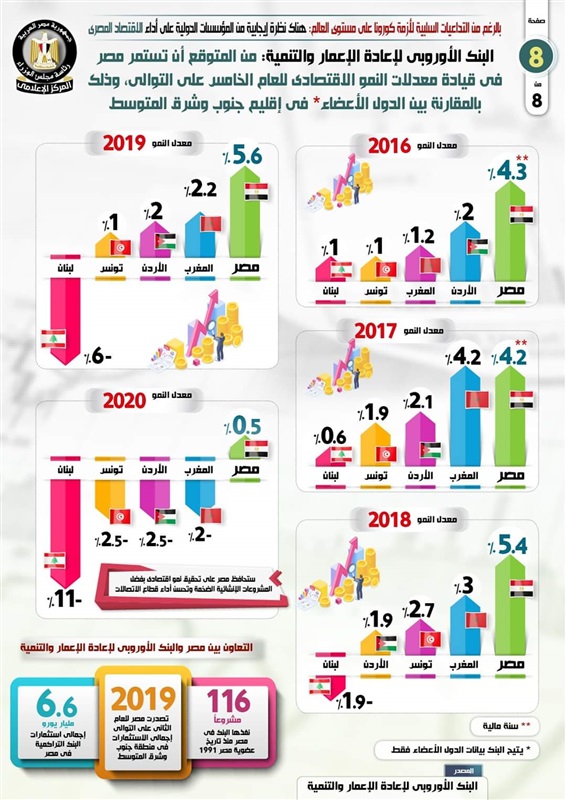 ورصد الإنفوجراف، أنه وفقاً لقائمة الدول الأعضاء بمنطقة جنوب وشرق المتوسط بالبنك الأوروبي لإعادة الإعمار والتنمية، فقد سجلت مصر معدل نمو 4.3% خلال العام المالي 2016، تليها الأردن بمعدل نمو 2% خلال عام 2016، ثم المغرب بمعدل نمو 1.2% خلال العام نفسه، وتونس ولبنان بمعدل نمو 1% لكل منهما خلال نفس العام، كما سجل معدل نمو الاقتصاد المصري 4.2% خلال العام المالي 2017، وكذلك سجل معدل نمو الاقتصاد المغربي 4.2% عام 2017، تليه الأردن بمعدل نمو 2.1% خلال العام نفسه، ثم تونس بمعدل نمو 1.9% خلال نفس العام، ولبنان بمعدل نمو 0.6% خلال العام نفسه.