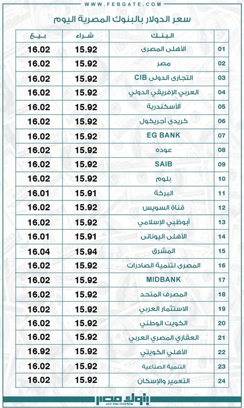 وفي مسح لـ”بنوك مصر” شمل 24 بنكًا عاملًا بالسوق المصرية، سجل أقل سعر لصرف الدولار في البنوك التالية: البركة ـ الأهلي اليوناني عند مستوى 15.91 جنيهًا للشراء، و16.01 جنيهًا للبيع.