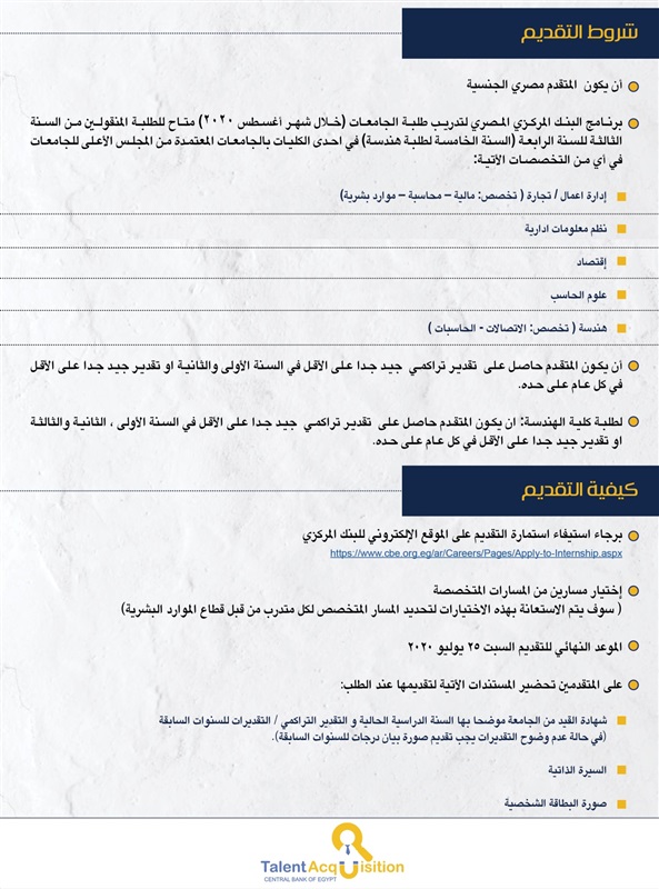 . أعلن البنك المركزي المصري، عبر موقعه الرسمي، عن فتح باب التقديم لبرنامج التدريب الصيفي لطلاب الجامعات عن بعد “Explore”، على أن يتم التدريب خلال شهر أغسطس 2020.