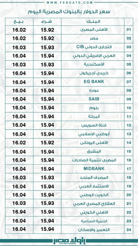 استقر سعر صرف الدولار في بداية تعاملات الأربعاء في 23 بنكًا، وسجل أعلى سعر له في البنوك التالية: (العربي الإفريقي ـ كريدي أجريكول ـ المصري الخليجي ـ عَوده ـ saib ـ بلوم ـ البركة ـ قناة السويس ـ أبو ظبي الإسلامي ـ المشرق ـ المصري لتنمية الصادرات ـ MIDBANK ـ الاستثمار العربي ـ الكويت الوطني ـ الأهلي الكويتي ـ التنمية الصناعية ـ التعمير والإسكان) عند مستوى 15.94 جنيهًا للشراء، و16.04 جنيهًا للبيع.
