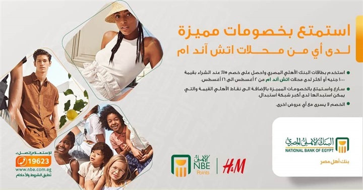 أعلن البنك الأهلي المصري، عبر صفحته الرسمية على موقع التواصل الاجتماعي “فيس بوك”، لعملائه حاملي بطاقات البنك خصم 15% عند الشراء بقيمة 1000 جنيه لدى أي من محلات “H&M”، والدفع باستخدام أي من بطاقات البنك الأهلي المصري، وذلك في الفترة من 2 إلى 16 أغسطس 2020.
