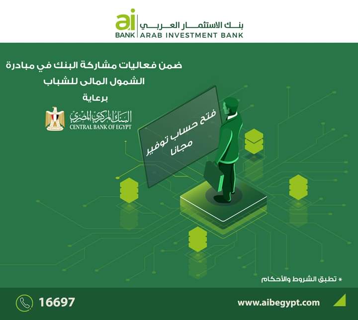 تحت رعایة البنك المركزي المصري وبمناسبة فعاليات الشمول المالي للشباب، أعلن بنك الاستثمار العربي، عبر صفحته الرسمية على موقع التواصل الاجتماعي “فيس بوك”، عن إمكانية فتح حساب بنكي للشباب دون مصاريف إدارية، ودون حد أدنى، والحصول على بطاقة مسبقة الدفع مجانًا، وذلك خلال الفترة من 9 إلى 24 أغسطس 2020.