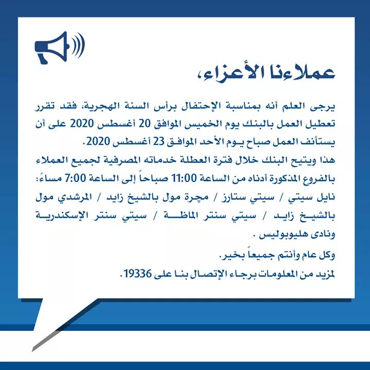 هذا ويتيح البنك خلال فترة العطلة خدماته المصرفية لجميع العملاء بالفروع المذكورة أدناه من الساعة 11 صباحًا إلى الساعة 7 مساءً “نايل سيتي، سيتي ستارز، مچرة مول بالشيخ زايد، المرشدي مول الشيخ زايد، سيتي سنتر الماظـة، سيتي سنتر الإسكندرية ونادي هليوبوليس”.