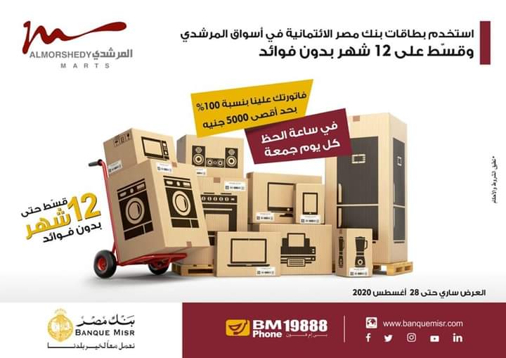. أعلن بنك مصر، عبر صفحته الرسمية على موقع التواصل الاجتماعي “فيسبوك”، لعملائه عن إمكانية تقسيط مشترياتهم من ” أسواق المرشدي” على 12 شهرا بدون فوائد باستخدام بطاقات البنك الائتمانية.