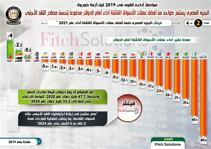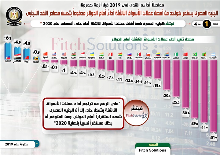 لتأتي بعد ذلك توقعات وكالة “فيتش” باستمرار الجنيه المصري ضمن الأفضل أداءً بين عملات الأسواق الناشئة عام 2021، مقارنة بعام 2019.