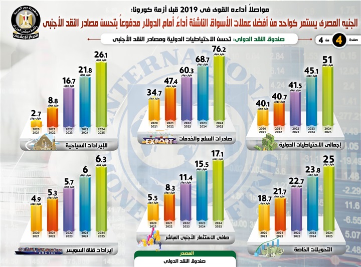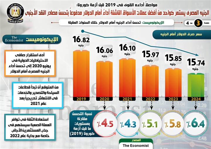 ونشر المركز الإعلامي لمجلس الوزراء، تقريراً تضمن إنفوجرافات تسلط الضوء على استمرار الجنيه المصري كواحد من أفضل عملات الأسواق الناشئة أداءً أمام الدولار مدفوعاً بتحسن مصادر النقد الأجنبي، مواصلاً بذلك أداءه القوي في 2019 قبل أزمة كورونا.