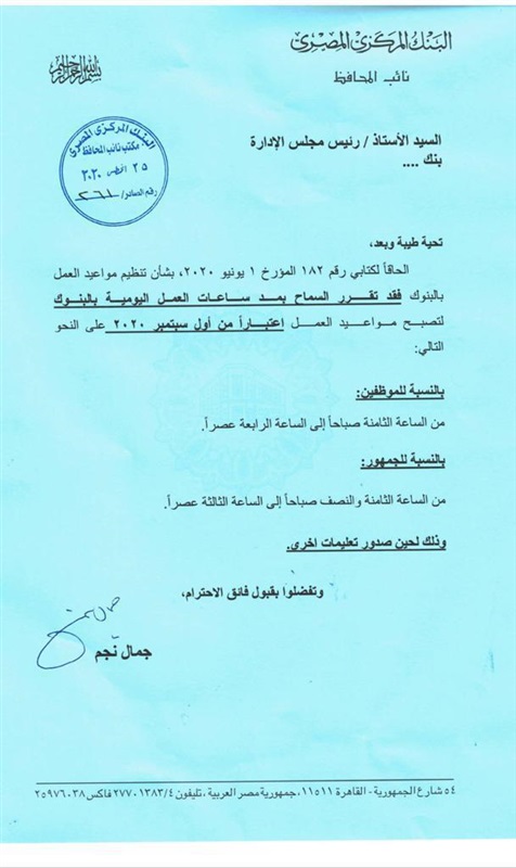 أعلن البنك المركزي المصري عن مواعيد العمل الجديدة في البنوك لتصبح بدءا من أول سبتمبر 2020 كالتالي: