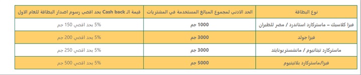 الحد الأدنى لمجموع المبالغ المستخدمة في المشتريات وقيمة الـ Cash back بحد أقصى رسوم إصدار البطاقة للعام الأول وفقًا ونوع البطاقات الائتمانية كالتالي: