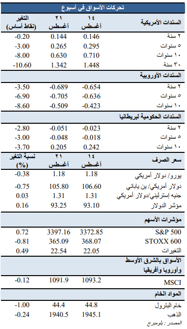 أنهى مؤشر الدولار تعامل style=”font-size: 14pt;”>أنهى مؤشر الدولار تعاملات الأسبوع مرتفعًا على خلفية البيانات القوية لنشاط القطاع العقاري، ومؤشر مديري المشتريات، وذلك بالرغم من صدور بيانات أولية محبطة بشأن حجم الطلبات المقدمة للحصول على إعانة البطالة. وكان الدولار قد سجل انخفاضا خلال الأسبوع ليصل لأدنى مستوياته على مدار عامين، وذلك في يوم 17 أغسطس، كما سجل اليورو تراجعاً مع ورود بيانات أضعف من المتوقع. ولم يسجل الجنيه الإسترليني تغيراً يذكر خلال الأسبوع. كما ظل مؤشر مورجان ستانلي لعملات الأسواق الناشئة MSCI EM دون تغيير تقريبًا خلال الأسبوع. وانخفضت أسعار الذهب خلال الأسبوع نتيجة ارتفاع وقوة الدولار.