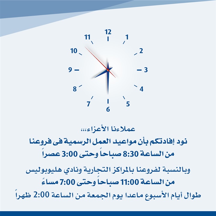 . أعلن بنك الكويت الوطني _ مصر ، عبر صفحته الرسمية على موقع التواصل الاجتماعي “فيس بوك”، لعملائه أنه ابتداءً من الغد الموافق الثلاثاء 1 سبتمبر 2020، سيتم تعديل مواعيد العمل الرسمية؛ لتصبح بالنسبة للجمهور من الساعة الـ8:30 صباحًا إلى الساعة الـ3 عصرًا، وبالنسبة لفروع المراكز التجارية ونادي هيلوبوليس من الساعة 11 صباحًا وحتى الـ7 مساءً طوال أيام الأسبوع ماعدا يوم الجمعة من الساعة الـ2 ظهرًا، وذلك تطبيقًا لقرار البنك المركزي المصري، الذي نص على تعديل مواعيد عمل البنوك.