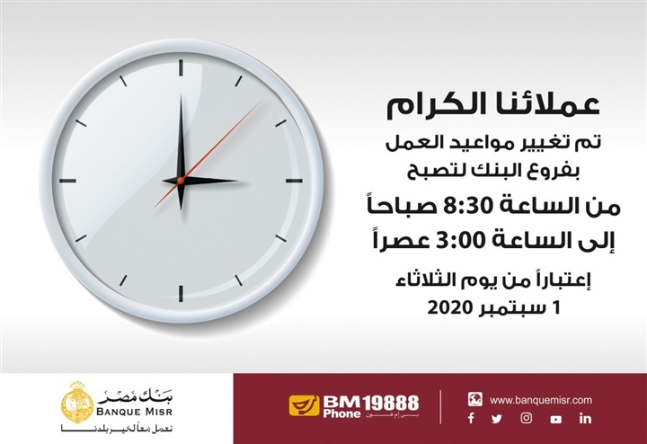 أعلن بنك مصر، عبر صفحته الرسمية على موقع التواصل الاجتماعي “فيسبوك”، لعملائه أنه ابتداءً من الغد الموافق الثلاثاء 1 سبتمبر 2020، سيتم تعديل مواعيد العمل الرسمية؛ لتصبح بالنسبة للجمهور من الساعة الـ8:30 صباحًا إلى الساعة الـ3 عصرًا، وذلك تطبيقًا لقرار البنك المركزي المصري، الذي نص على تعديل مواعيد عمل البنوك.