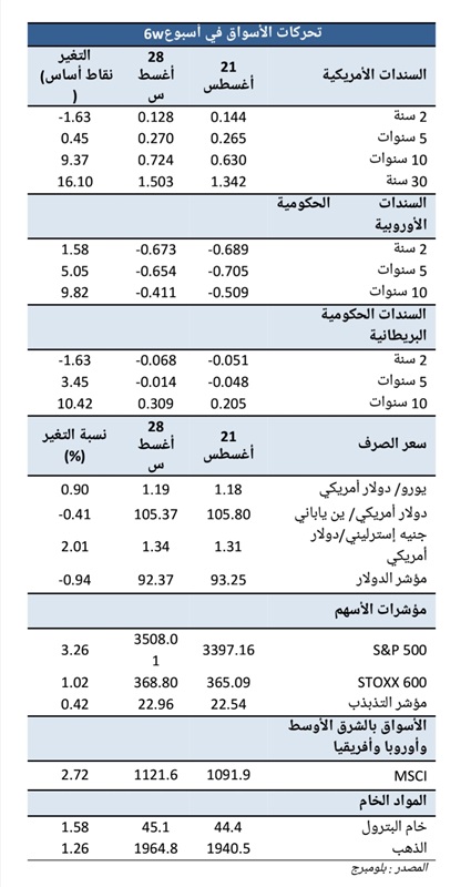 ارتفعت أسواق الأسهم العالمية هذا الأسبوع بفضل التقدم المحرز في إنتاج لقاح فيروس كورونا، وتحسن الخطاب بين الولايات المتحدة والصين. كما دفع الخطاب الذي ألقاه جيروم باول بجاكسون هول الأسهم الأمريكية للارتفاع، حيث أعلن فيه عن إطار جديد للسياسة النقدية لبنك الاحتياطي الفيدرالي؛ مما يشير إلى بقاء أسعار الفائدة منخفضة لفترة أطول. وقد واصلت الأسهم الأمريكية تسجيل مستويات قياسية، حيث حقق خلال الأسبوع مؤشري S&P 500 وناسداك المركب ارتفاعا بنسبة 3.26% و3.39% على التوالي.