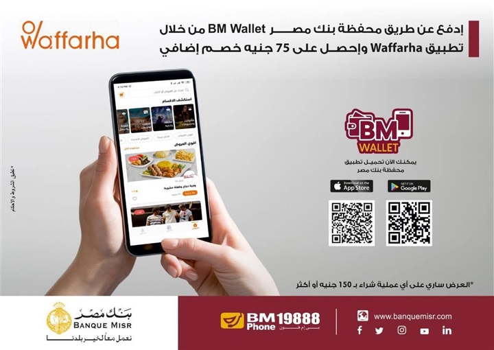 أعلن بنك مصر لعملائه، عبر صفحته الرسمية على موقع التواصل الاجتماعي “فيسبوك”، عن إمكانية استخدام المحفظة الإلكترونية للبنك BM Wallet في التعاملات، والحصول على 75 جنيها خصما على المشتريات من تطبيق Waffarha.