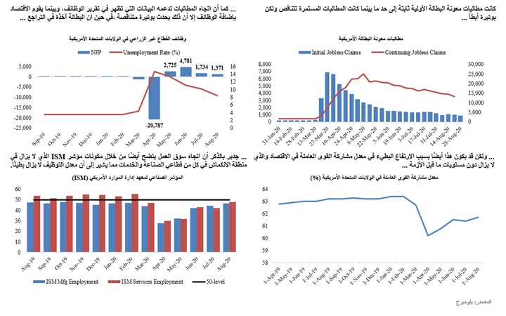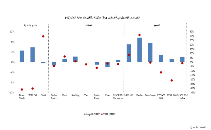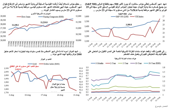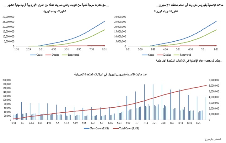 وكانت وتيرة التحسن في البيانات الاقتصادية معتدلة بشكل عام، وفي خضم هذه الأوضاع الاقتصادية، ضربت موجة ثانية من الفيروس عددًا من الدول الأوروبية حيث وصل عدد الحالات اليومية الجديدة المبلغ عنها إلى مستويات غير مسبوقة منذ شهور، بينما تراجعت أعداد الإصابات في الولايات المتحدة، وكان سوق الأسهم الأمريكية هو المحور الرئيسي لأحداث الشهر الماضي، حيث سجل أعلى مستوياته على الإطلاق، ليمحو بذلك الخسائر الناجمة عن الوباء بدعم من أسهم قطاع التكنولوجيا.