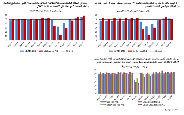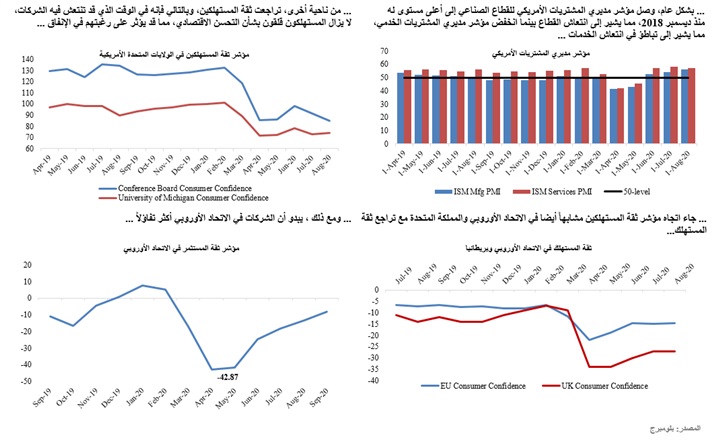 أظهرت البيانات الاقتصادية انتعاش الاقتصاد الأمريكي،في أغسطس، ولكن يبدو أن التحسن غير منتظم، حيث أظهرت مؤشرات قطاع التصنيع وتيرة انتعاش أسرع من قطاع الخدمات وسوق العمل، وعلى الصعيد العالمي، في الوقت الذي أظهر قطاعي الأعمال والإنتاج تحسنًا، ظلت ثقة المستهلك ضعيفة مما زاد من المخاوف بشأن قدرة الأسواق على الانتعاش، إذ كان على المستهلكين نقل حالة عدم اليقين لديهم وترجمتها إلى خفض الاستهلاك.