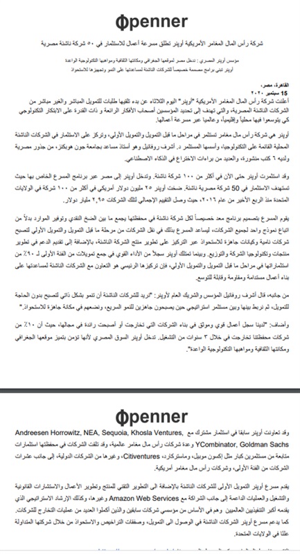 وقد استثمرت أوپنر حتى الآن في أكثر من 100 شركة ناشئة. وتدخل أوپنر إلى مصر عبر برنامج المسرع الخاص بها، حيث تستهدف الاستثمار في 50 شركة مصرية ناشئة.